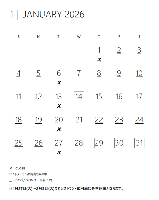 第2・第4水曜日はレストランと弦円庵のみ休業とさせていただきます。