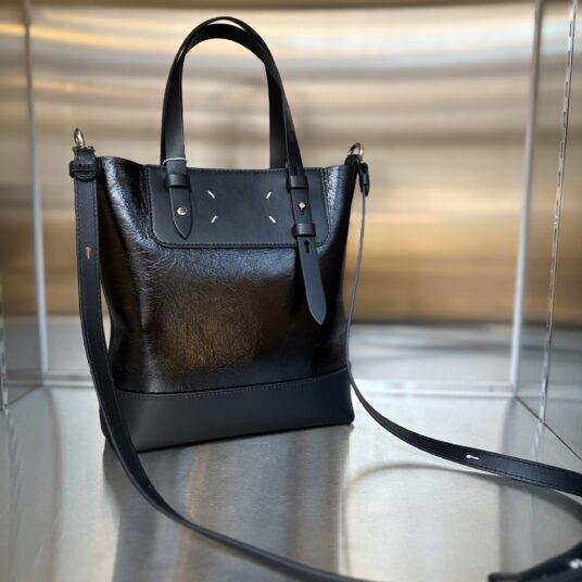 シワ加工が施された光沢レザーとカーフレザーが使用された、縦型のミニドローストリング バッグ バーティカル。